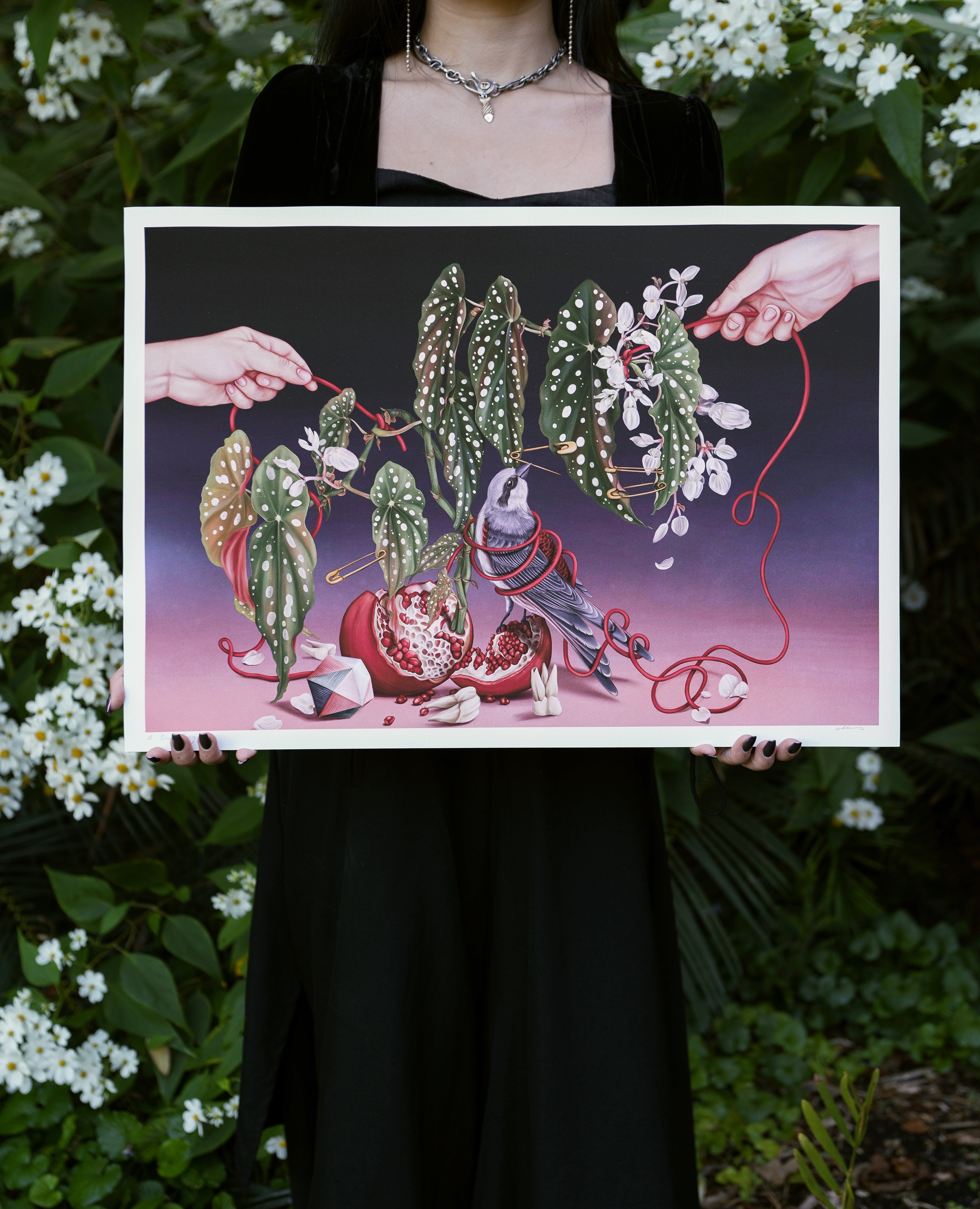 Chloe Shao is a Melbourne artist who creates surreal works blending anatomical forms with botanical elements. Her practice explores how the human body and nature intertwine, revealing unexpected connections between the two.